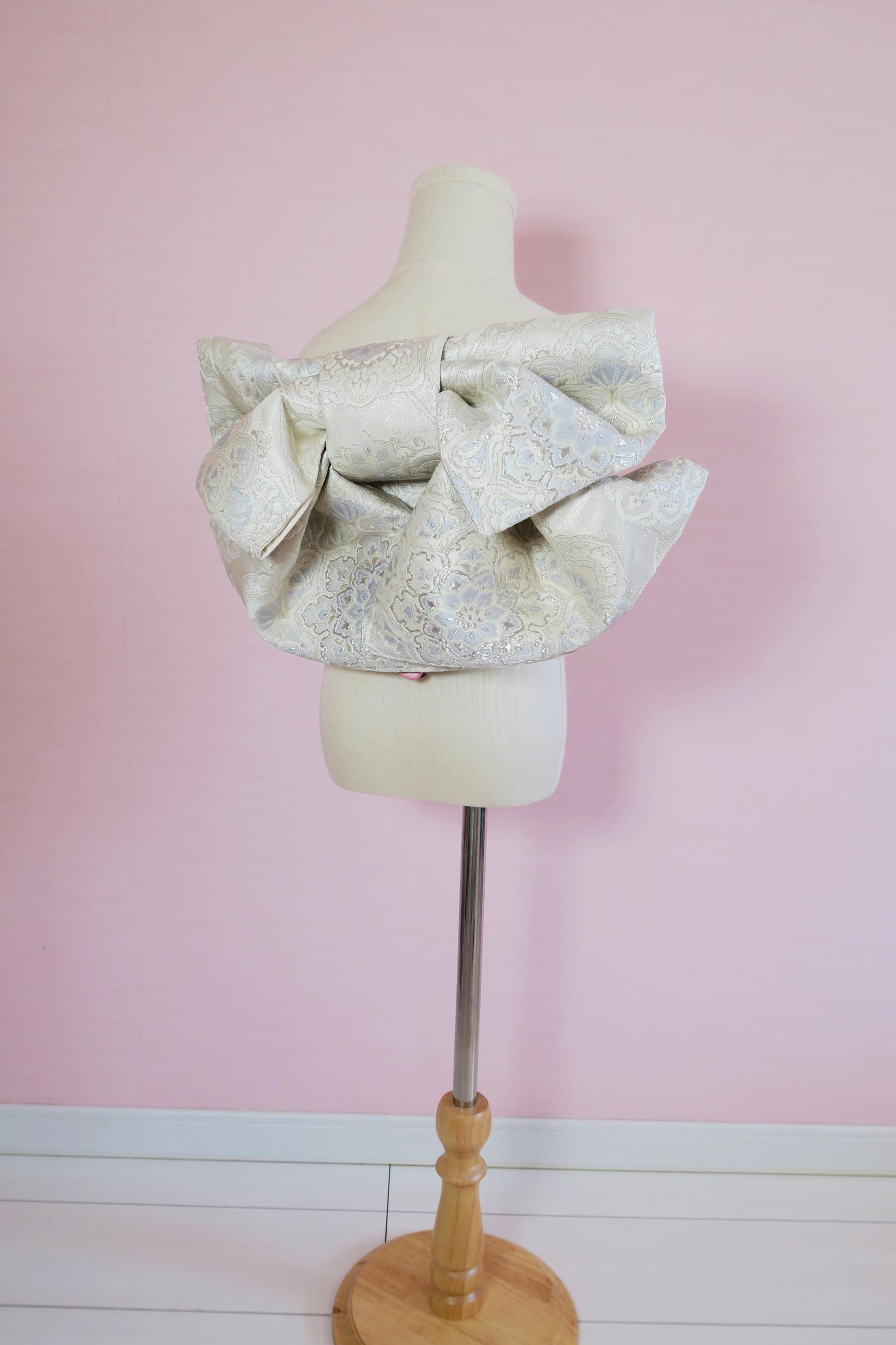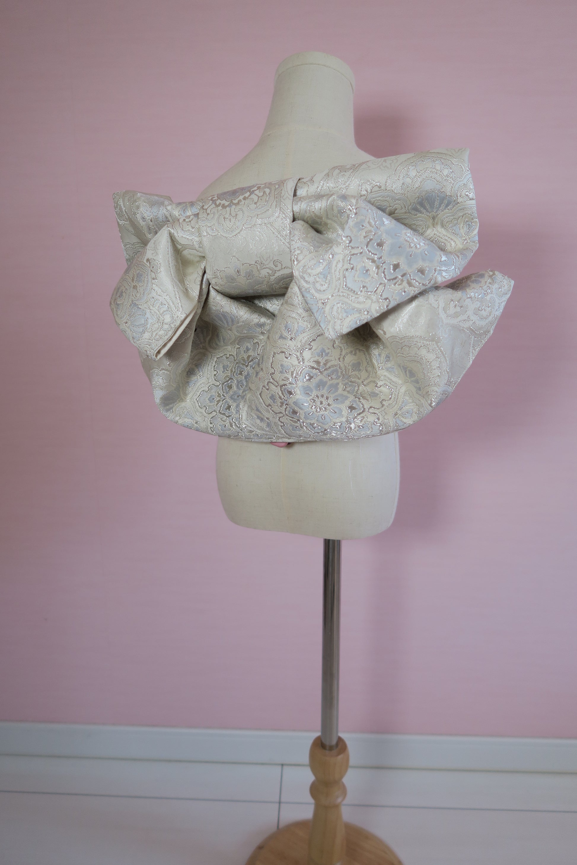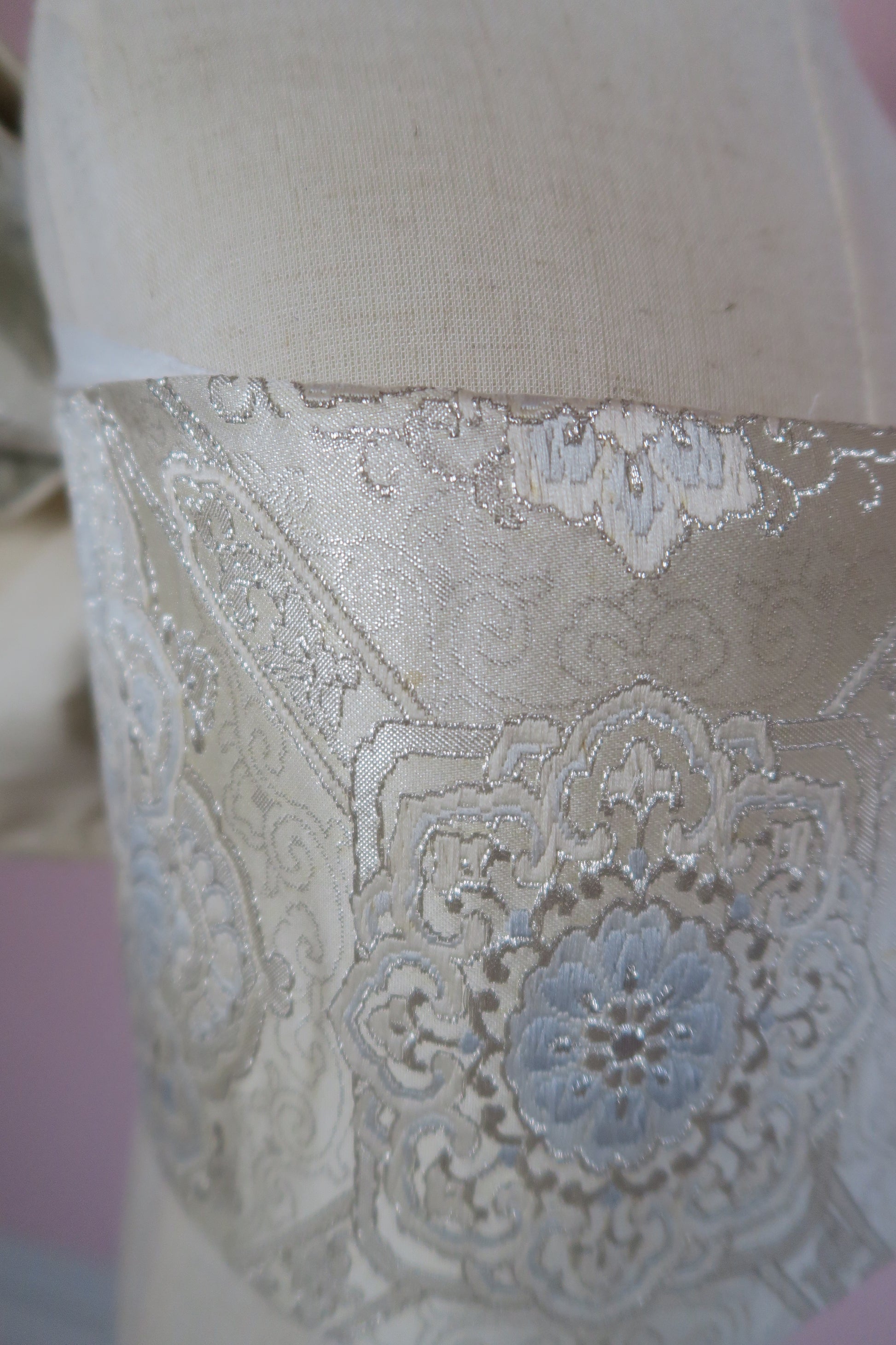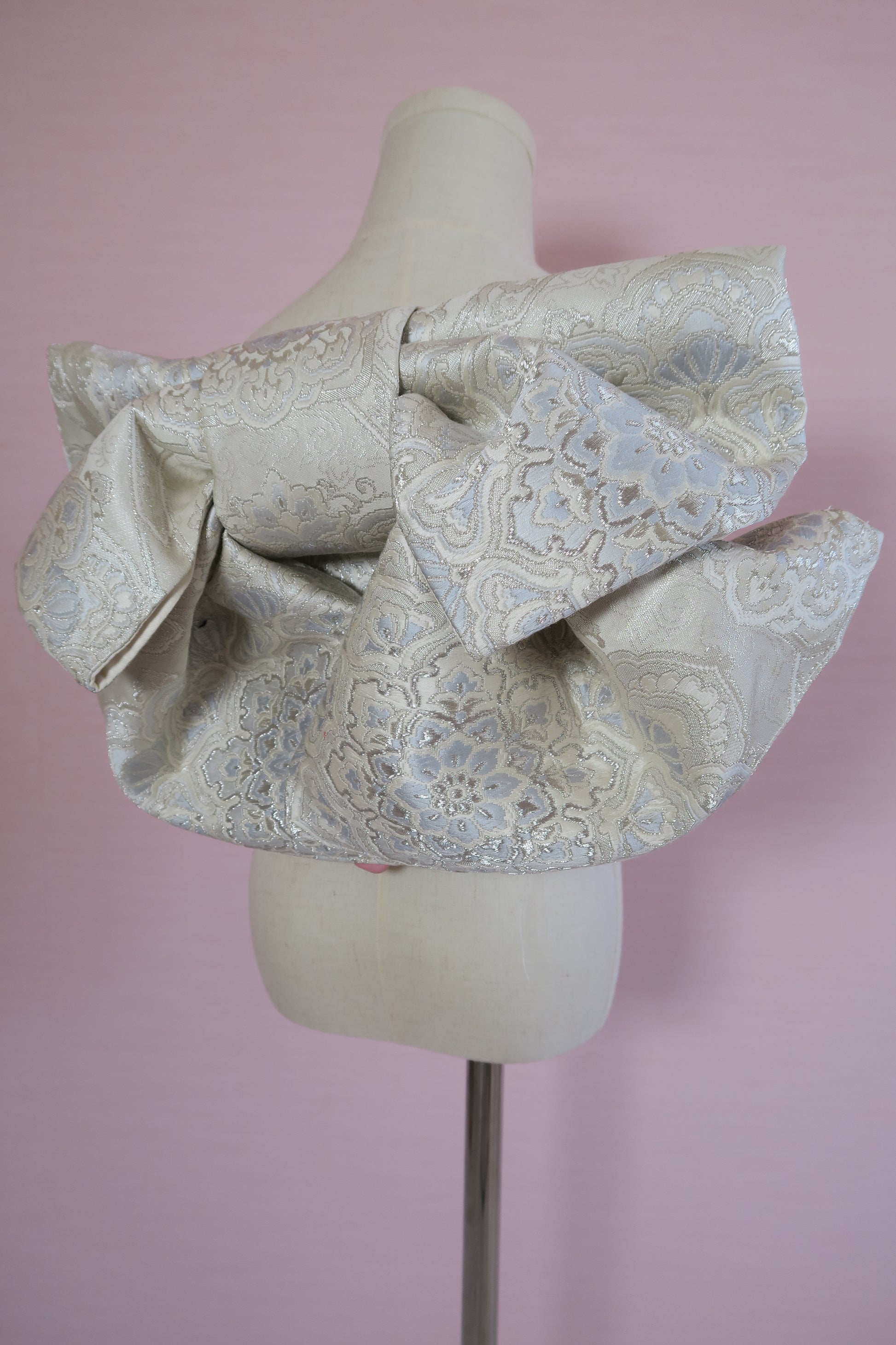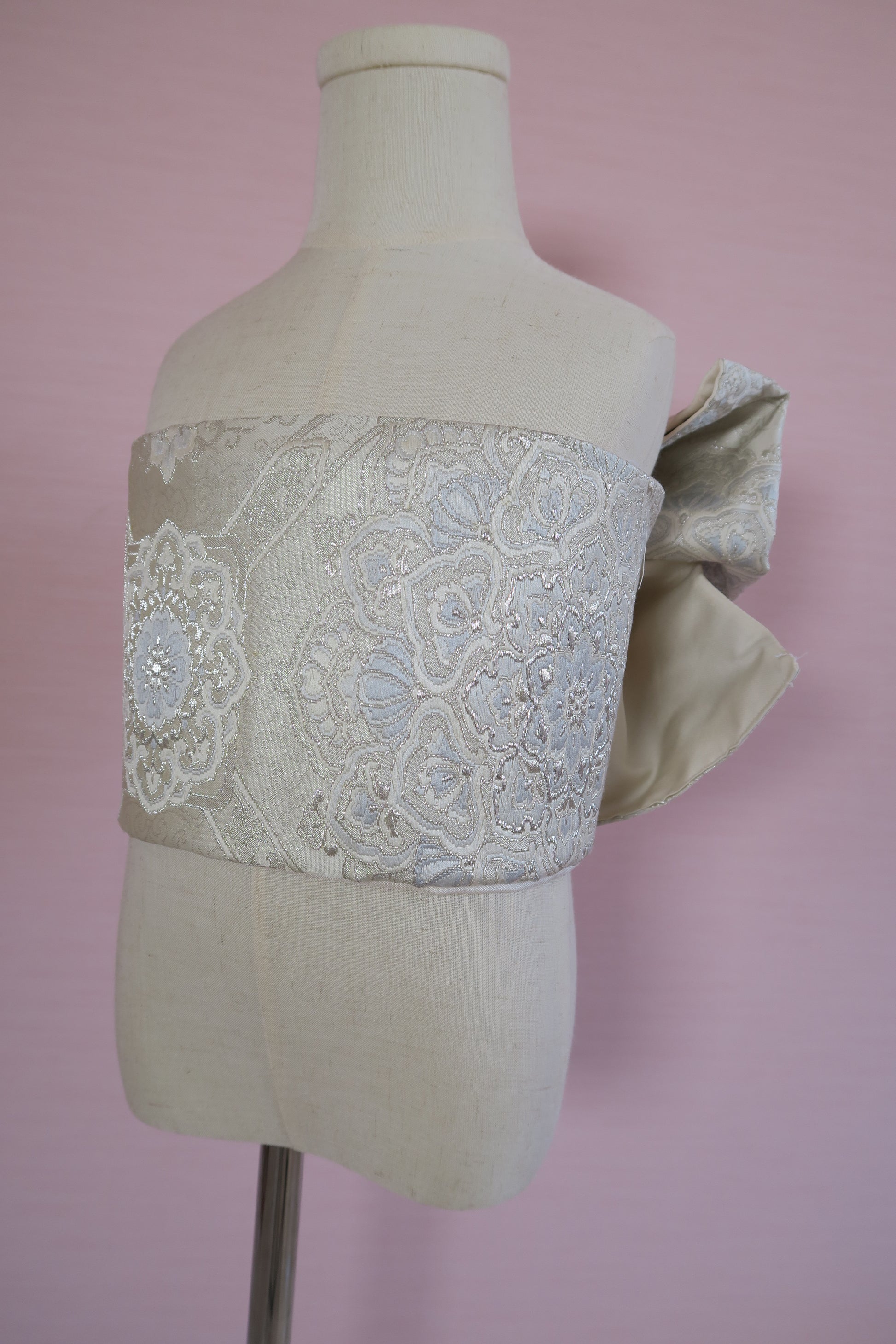 淡いシルバーと白を基調とした、上品なレース調文様のアンティークの帯で作りました。